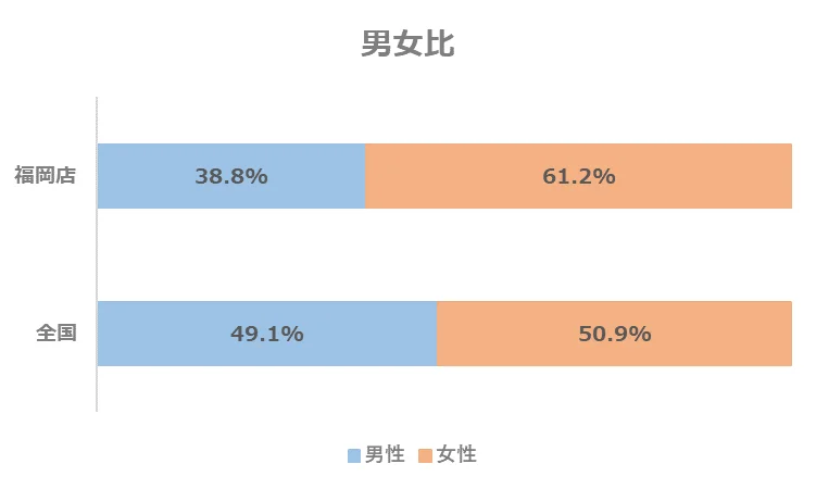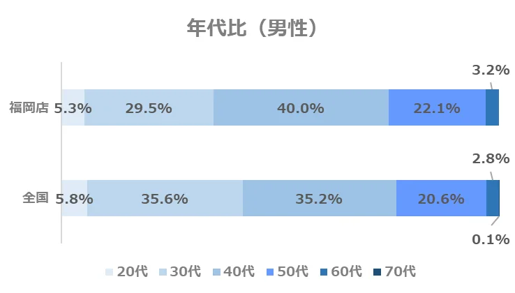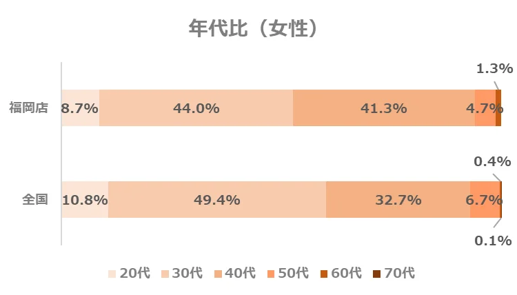 ただし、女性においても40代の割合は全国平均と比較して約10%高く、福岡店では男女ともに40代の利用者が多い傾向が見られます。