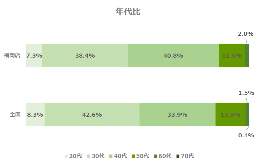 福岡店の年代別構成比は、全国と比べて40代の割合が高く、全体の4割強を占めています。これに対し、20代や30代の割合は全国平均よりもやや低い傾向にあります。