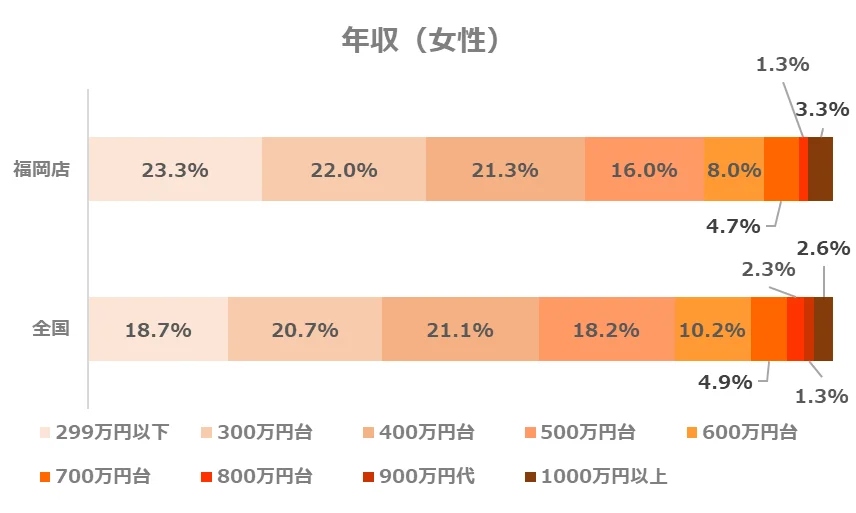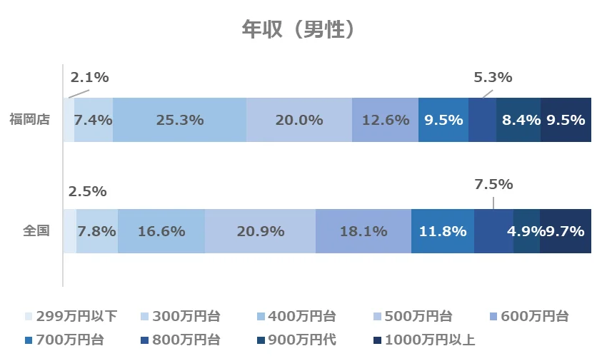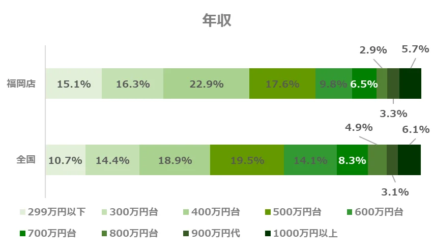 福岡店では、全国と比較して年収400万円台の方の割合がやや高くなっていますが、500万円台の方もそれに次いで多く、全国との差はわずか1.9%にとなっています。