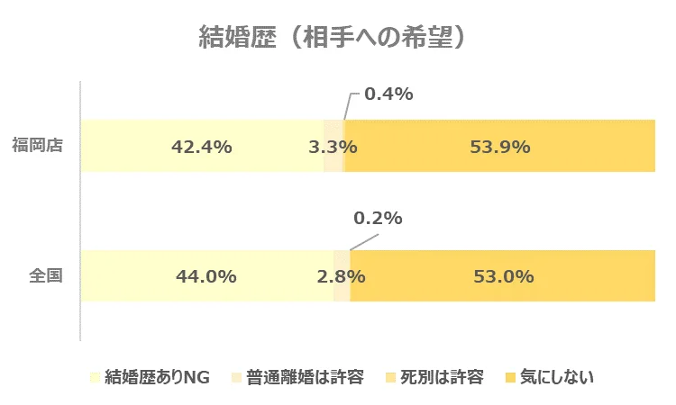 あわせて、お相手に求める結婚歴についてのデータを見てみると、「気にしない」と回答した方が、全国よりも0.9%高い結果となりました。