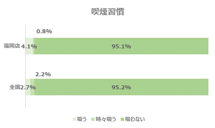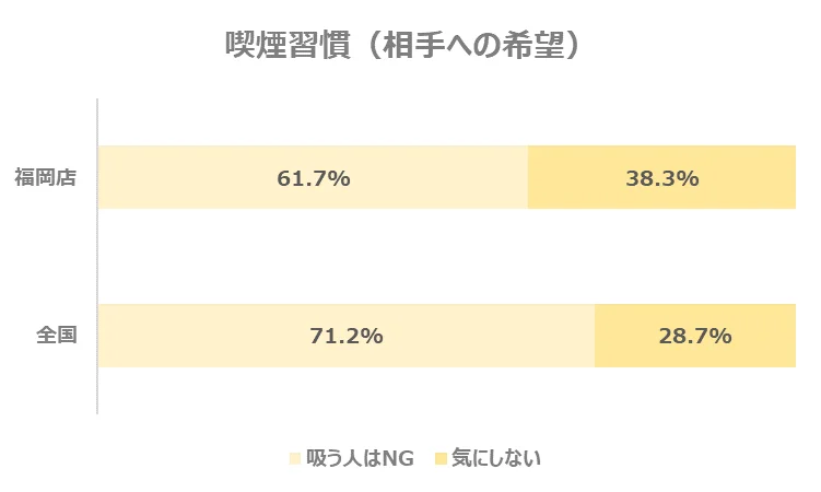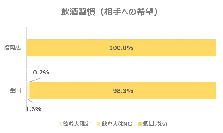 こちらもお相手に求める飲酒の習慣についてのデータを見てみると、福岡店の会員様全員が「気にしない」と回答し、100%という結果になりました。全国的にも「気にしない」という割合は比較的高いものの、福岡店ではその割合が特に際立っています。