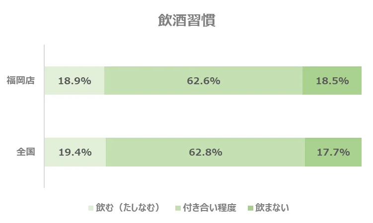 飲食店が多く、屋台文化も根付いているため、お酒を飲むことが当たり前のように思われがちな福岡県ですが、パートナーエージェント福岡店で活動中の会員様においては、18.5%の人が「飲まない」と回答しました。この割合は、全国平均よりも高い結果となっています。