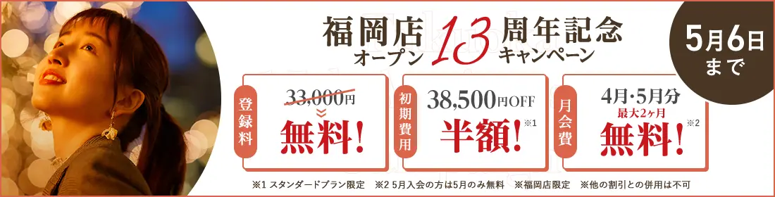 こうしたなか、「パートナーエージェント福岡店」は、2012年4月にオープンし、地域の皆さまに支えられながら、2025年4月に13周年を迎えました。そしてこれまでの13年間で、1,446人(2025年3月末現在)の成婚を実現してまいりましたが、これからもより多くの方の成婚を実現していきたいと考えております。その一環として、福岡店で活動されている会員様の婚活傾向をまとめたレポートを作成し、公表することといたしました。このレポートが、これから婚活を始める方々の参考となり、新たな出会いと成婚の一助となれば幸いです。また、期間限定のキャンペーンを2025年5月6日まで実施しています。
