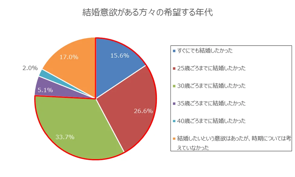 平均初婚年齢は上述のとおり男性31.1歳、女性29.7歳ですが、実際に最も多くの人が結婚している年齢は、男女ともに27歳となっています(厚生労働省「人口動態統計 」)。このデータと照らし合わせると、20代の「25歳ごろまでに結婚したい」という希望と、実際に結婚する年齢との間には大きなギャップはないことが伺えます。