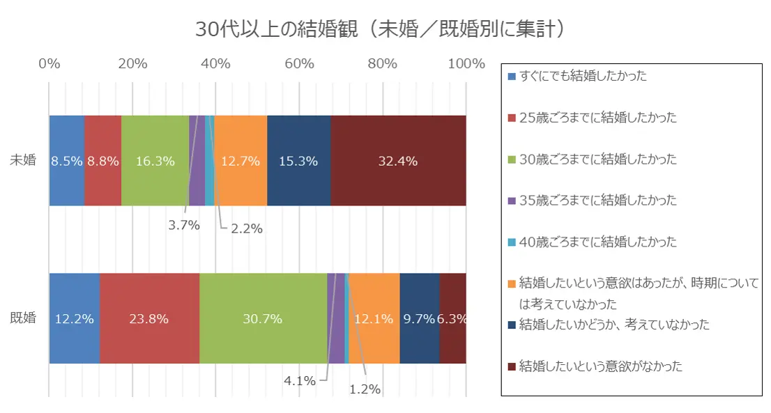 社会人になったばかりのころ、結婚を希望していたかどうかで、未婚か既婚かにどの程度影響してくるものでしょうか。先ほどの設問について、30代以降の回答を未婚と既婚に分けて集計してみました。