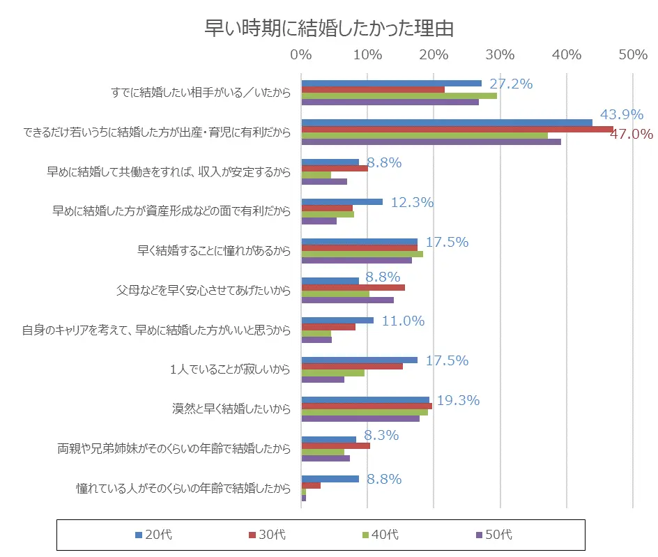 どの年代においても最も多かったのは「できるだけ若いうちに結婚した方が出産・育児に有利だから」で、特に30代では47.0%が「出産・育児に有利」を選んでいました。
