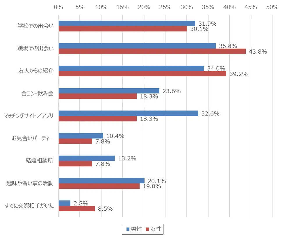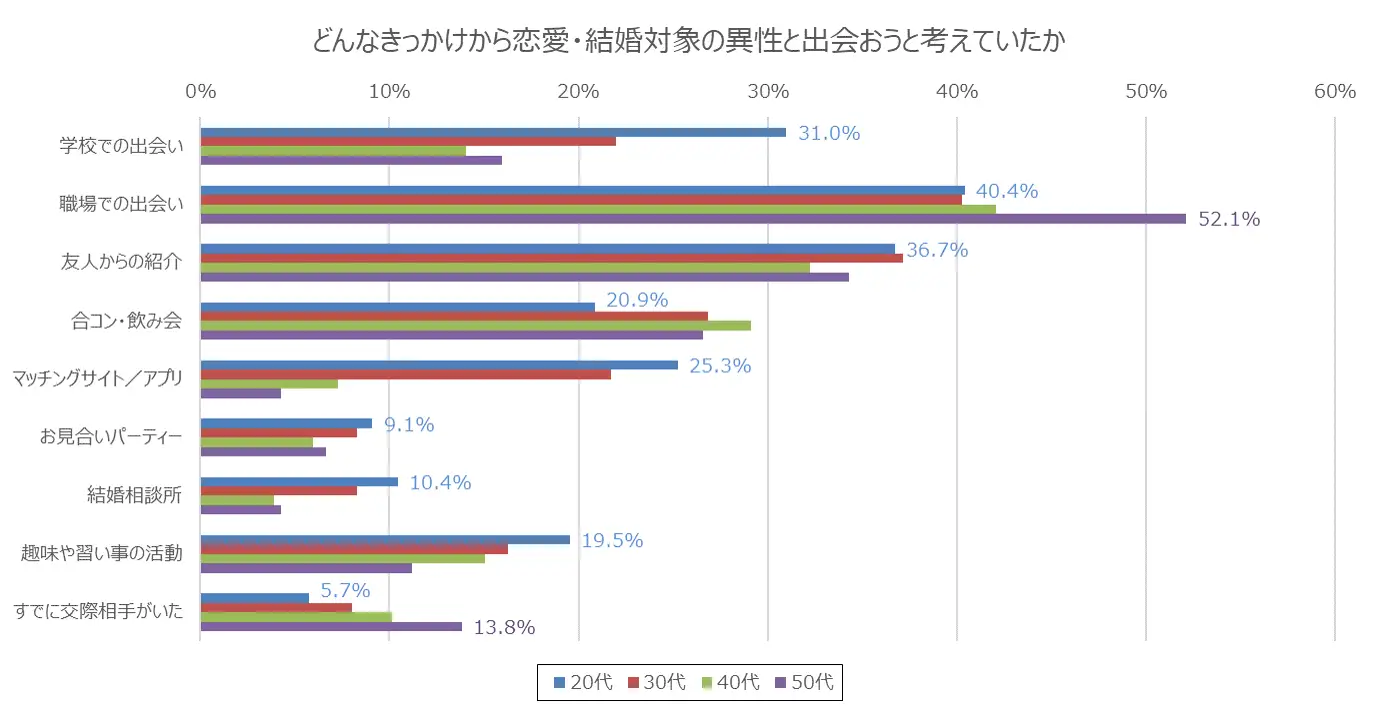 たとえば、「職場での出会い」を選んだ人の割合は、50代では52.1%だったのに対し、20代では40.4%にとどまっています。職場での出会いは今も一定の人気がありますが、以前と比べるとその割合は減少傾向にあることが伺えます。