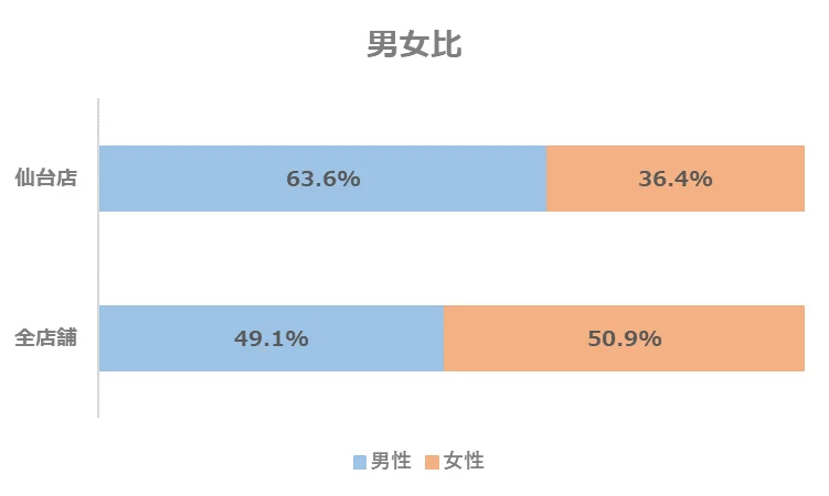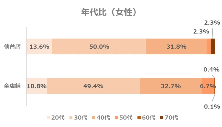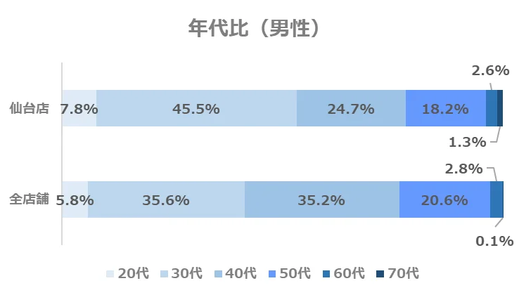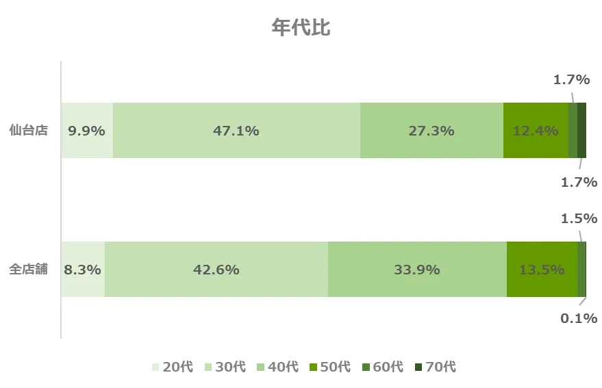 仙台店の年代別構成比は、全店舗と比べて30代の割合がやや高い傾向にあります。