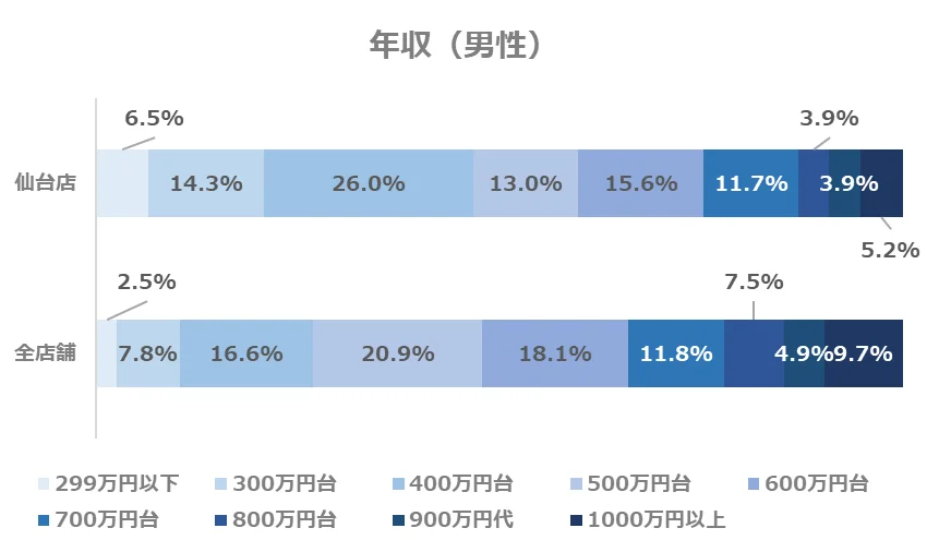 仙台店では、全店舗と比較して年収400万円台の方の割合が高く、ついで300万円台の方が多い結果となっています。