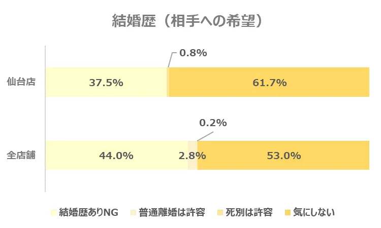 仙台店は全店舗と比較し、婚歴のある方が多い結果となりました。