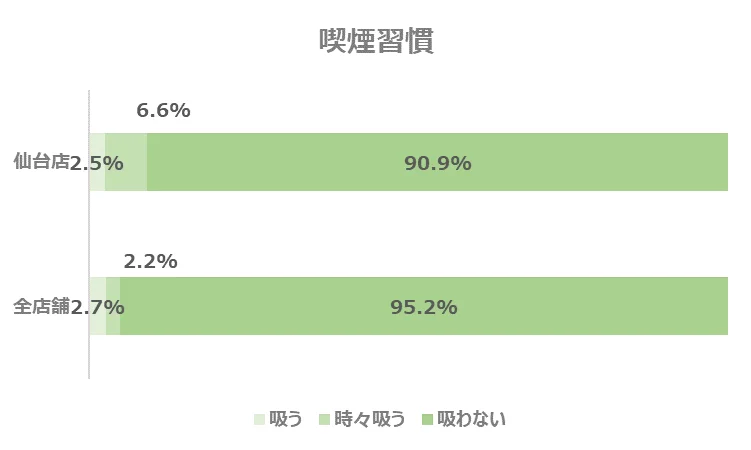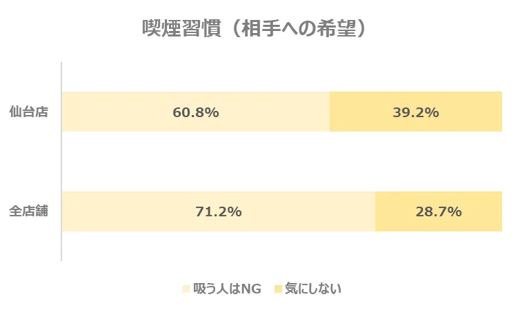 ただし、パートナーエージェント全体の会員様と比較すると、仙台店は喫煙している方の割合がやや高い傾向にあります。