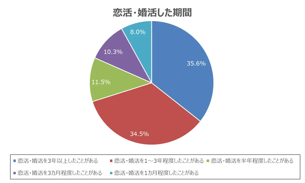 恋活・婚活の期間については、「3年以上」(14.4%)、「1~3年程度」(13.9%)、「半年程度」(4.6%)、「3カ月程度」(4.2%)、「1カ月程度」(3.2%)という結果でした。