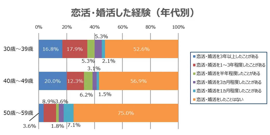 一方で、「恋活・婚活をしたことがない」と答えた人は59.7%にのぼり、過半数を占めました。