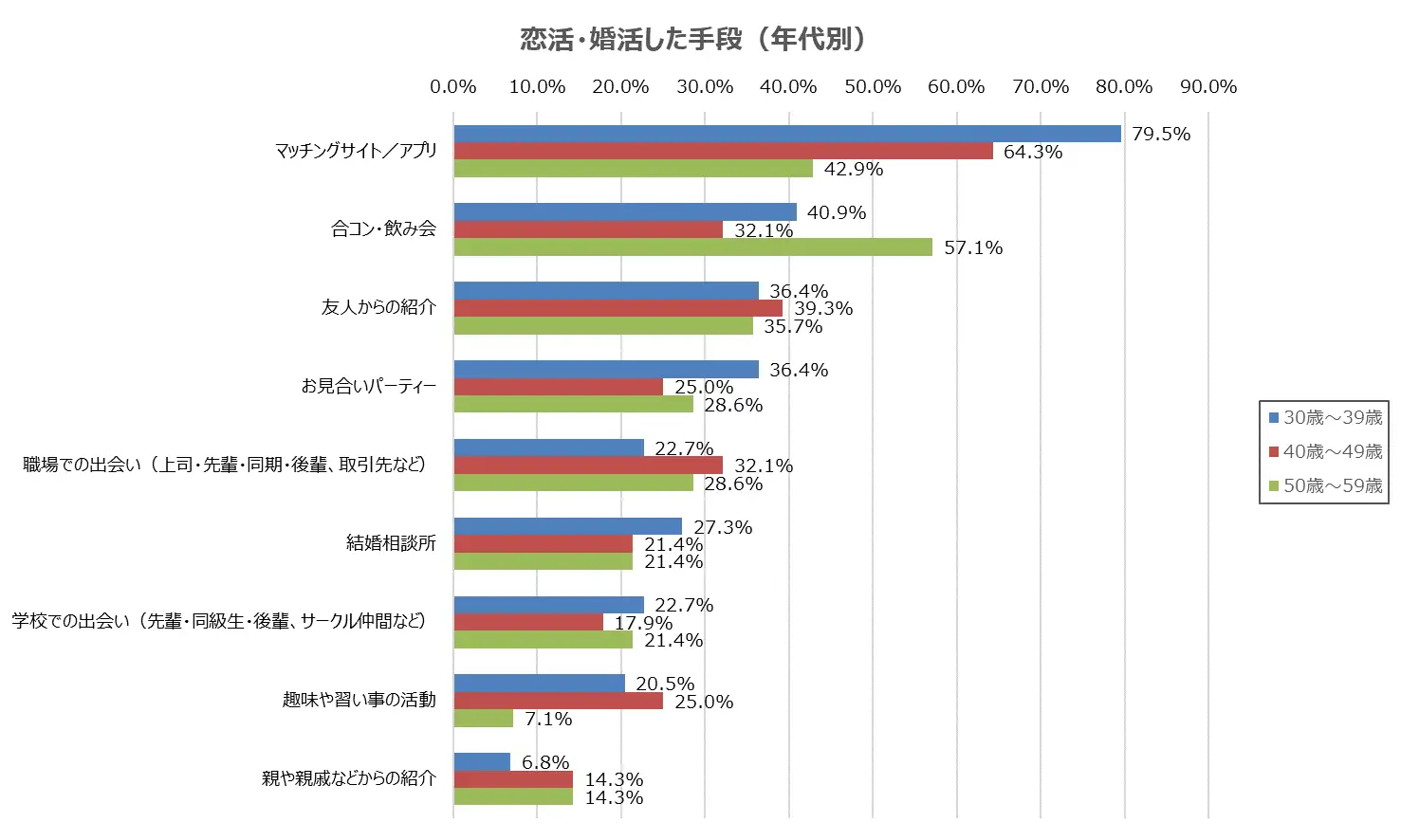先ほどのデータを年代別に集計したところ、「マッチングサイト/アプリ」「お見合いパーティー」「結婚相談所」といった恋活・婚活手段を利用する割合は30代が最も高い結果となりました。恋活・婚活サービスが充実し、自分から行動を起こして恋活・婚活する時代になってきたと言えるのではないでしょうか。