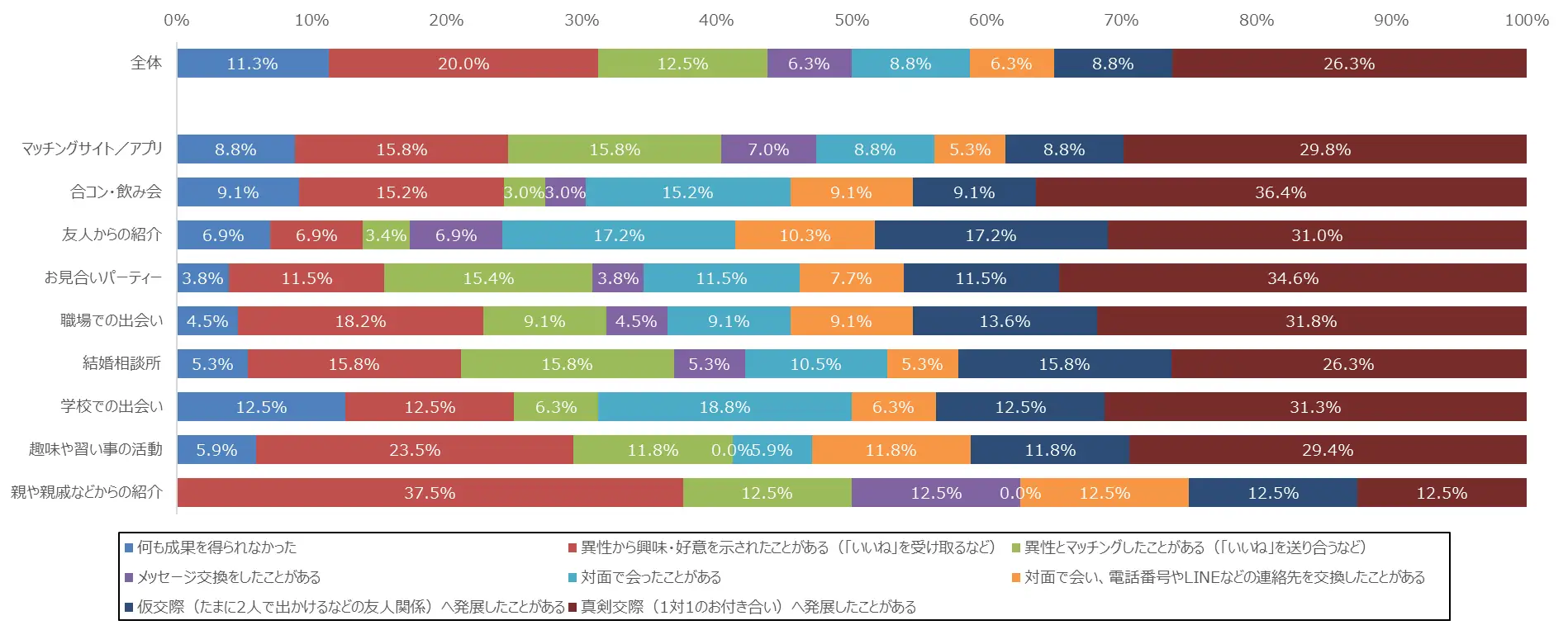 多くの手段において、「何も成果を得られなかった」は10%未満、「真剣交際に発展したことがある」は30%前後と、似たような傾向が見られました。