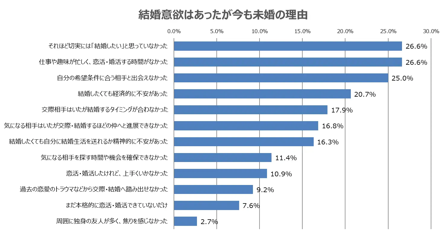 最も多かったのは、同率で「それほど切実には『結婚したい』と思っていなかった」と「仕事や趣味が忙しく、恋活・婚活する時間がなかった」(ともに26.6%)でした。
