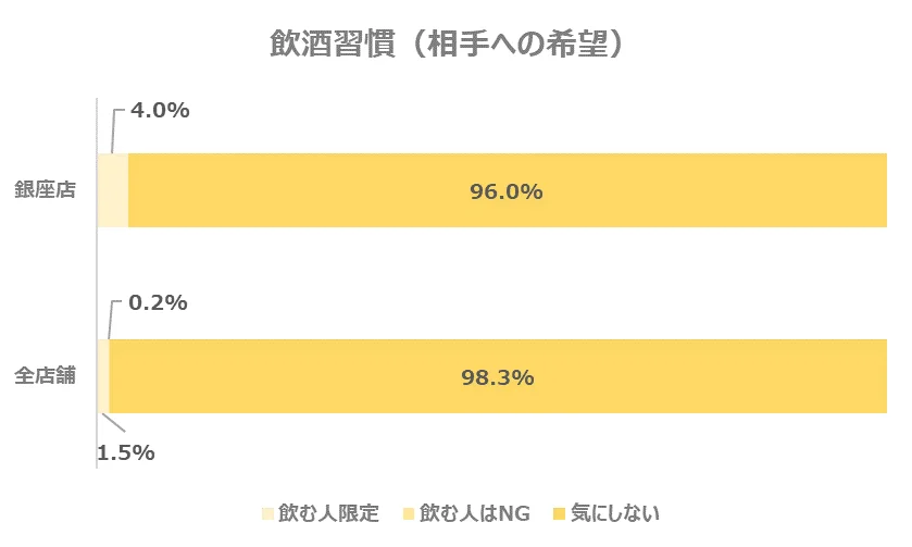 お相手に求める飲酒の習慣についてのデータを見てみると、銀座店の会員様は全店舗と比較すると、「飲む人限定」を希望する方の割合が多い結果となりました。