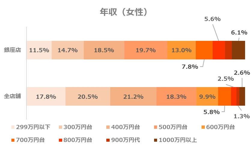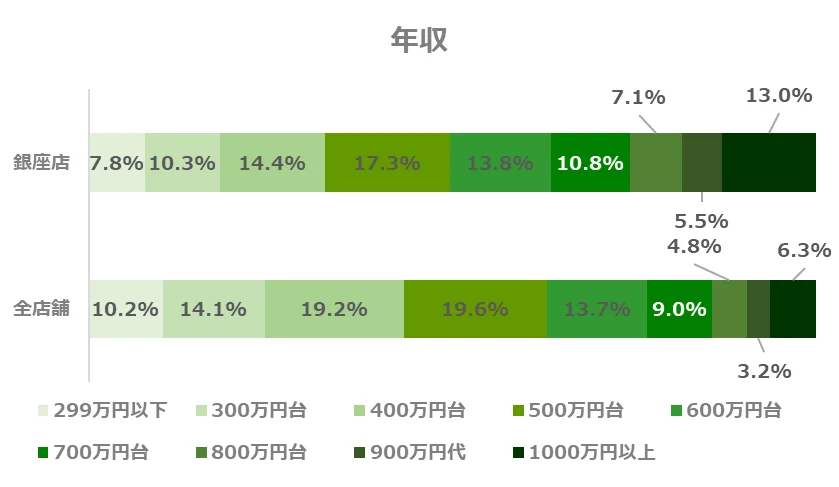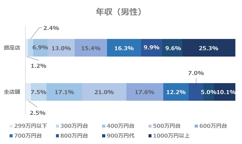 銀座店では、全店舗と比較して年収1,000万円以上の方の割合が約2倍となりました。