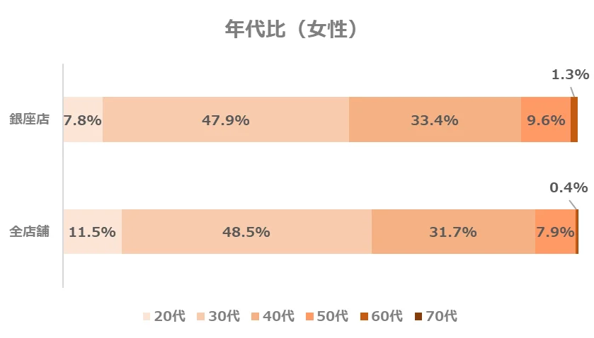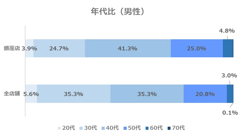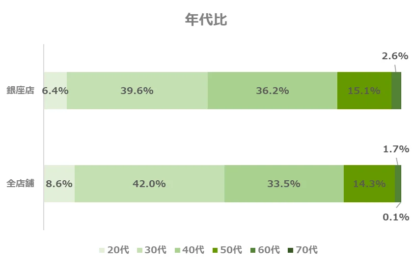 銀座店の年代別構成比は、全店舗と比べて40代以上の方の割合がやや高い傾向にありますが、より幅広い年代の方にご利用いただいている店舗と言えます。