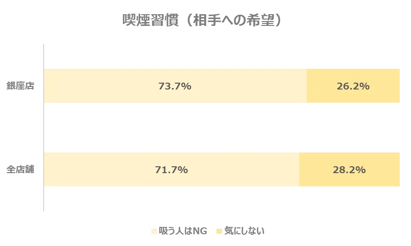 お相手に求める喫煙の習慣についてのデータを見てみると、全店舗とほぼ変わらない結果となりました。
