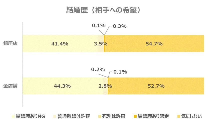 あわせて、お相手に求める結婚歴についてのデータを見てみると、「気にしない」と回答した方の割合は全店舗と比較し、やや高めでした。