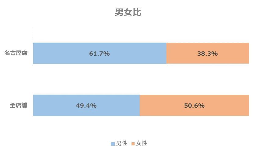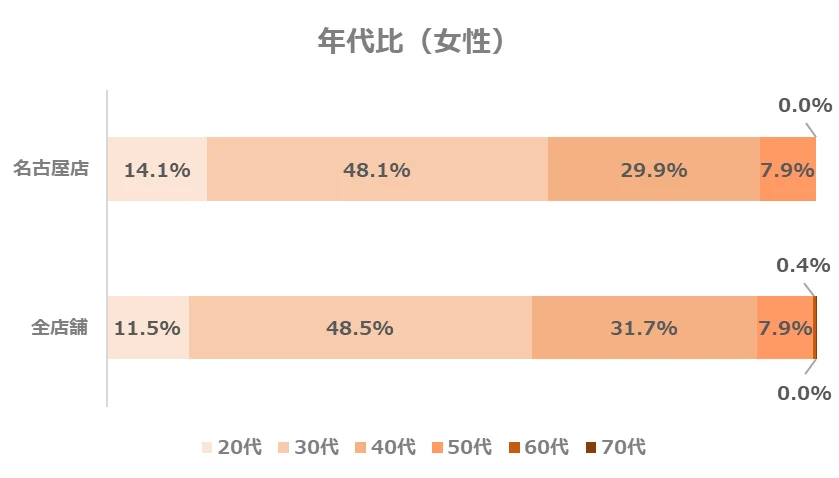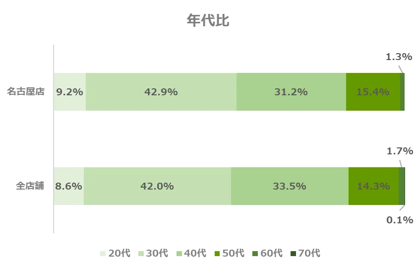 名古屋店の年代別構成比は、20~30代の割合が全店舗と比べるとやや高い傾向にあります。