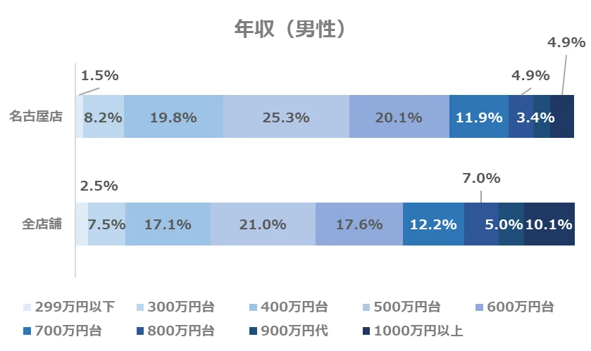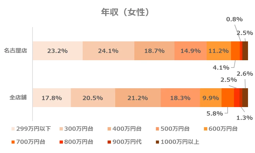 名古屋店では、全店舗と同様に年収500万円台が、最も多い層となっています。