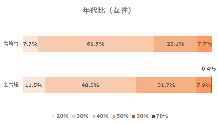 高崎店の年代別構成比については、全店舗と比べて20代と40代の割合がやや低く、30代の割合がやや高い傾向にあります。