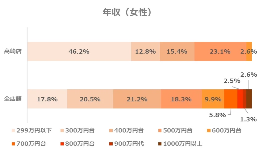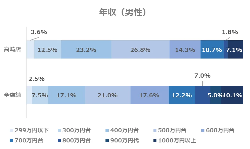 高崎店では、全店舗と同様に「年収500万円台」が最も多く、全体のおよそ4分の1を占めています。