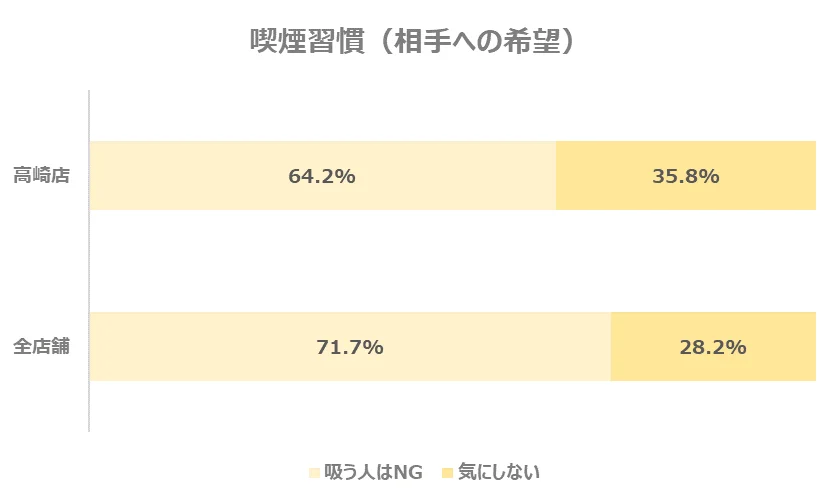 お相手に求める喫煙の習慣についてのデータを見てみると、「気にしない」と回答した割合は全店舗よりやや高い結果となりました。