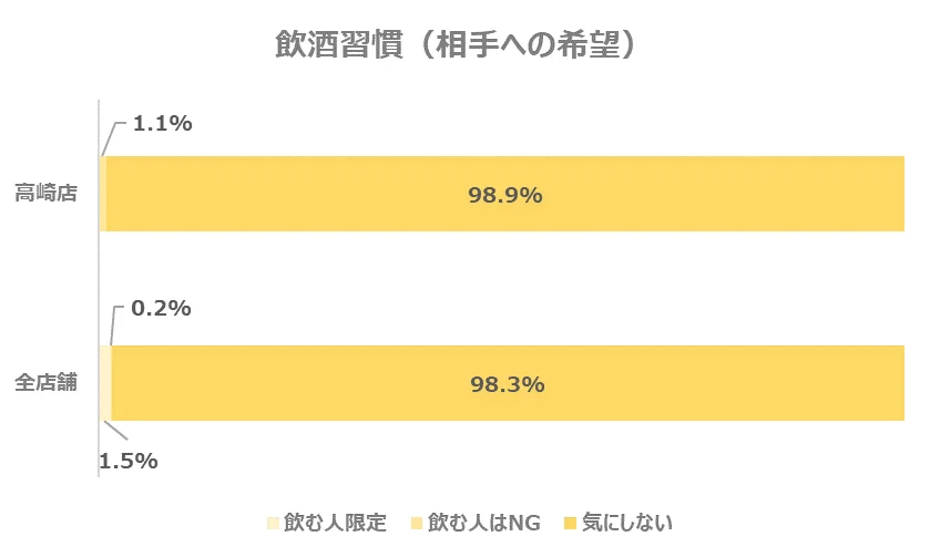 お相手に求める飲酒の習慣についてのデータをみてみると、高崎店では「飲む人はNG(1.1%)」「気にしない(98.9%)」となりました。