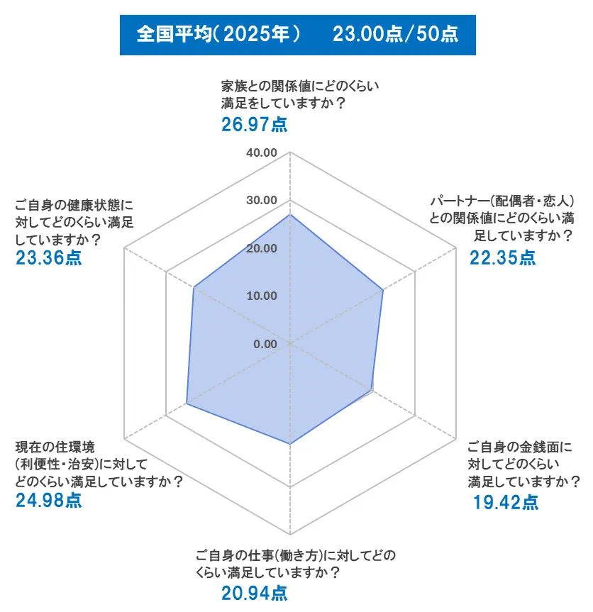 幸福度が最も高かったのは、3年連続で「家族との関係値」(26.97点)でした。最も低かったのは「金銭面」(19.42点)の満足度で、2024年調査(20.22点)、2023年調査(19.79点)よりもさらに低く、過去最低となりました。