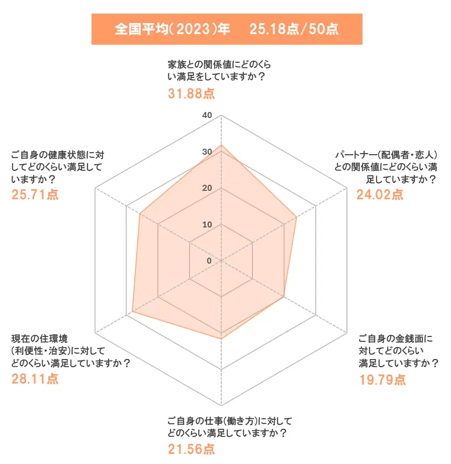 当社の幸福度調査では、「家族との関係値」「パートナー(配偶者・恋人)との関係値」「金銭面」「仕事(働き方)」「住環境」「健康状態」の6項目について、どのくらい幸福感を感じているかを調査しています。