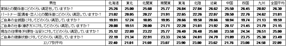エリア別で幸福度の男女差が大きかったのは近畿でした。男性23.62点、女性25.56点と1.94ポイントの差があり、女性が最も高いエリアも近畿でした。なお、男性が女性よりも幸福な地域のうち最も差が大きかったのは北陸で、男性23.80点、女性22.69点と1.11ポイントの差となりました。