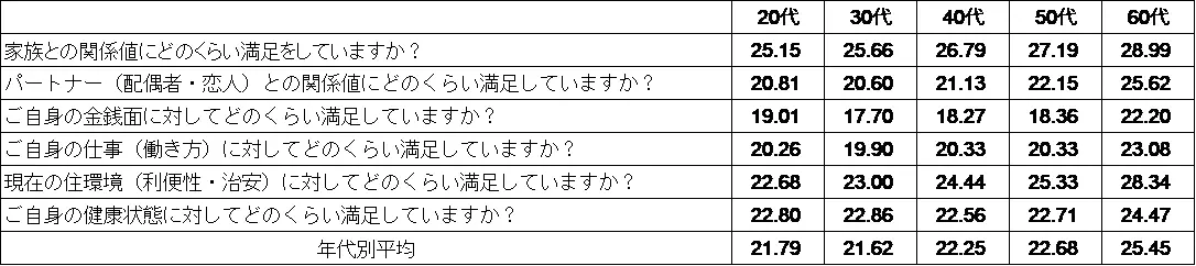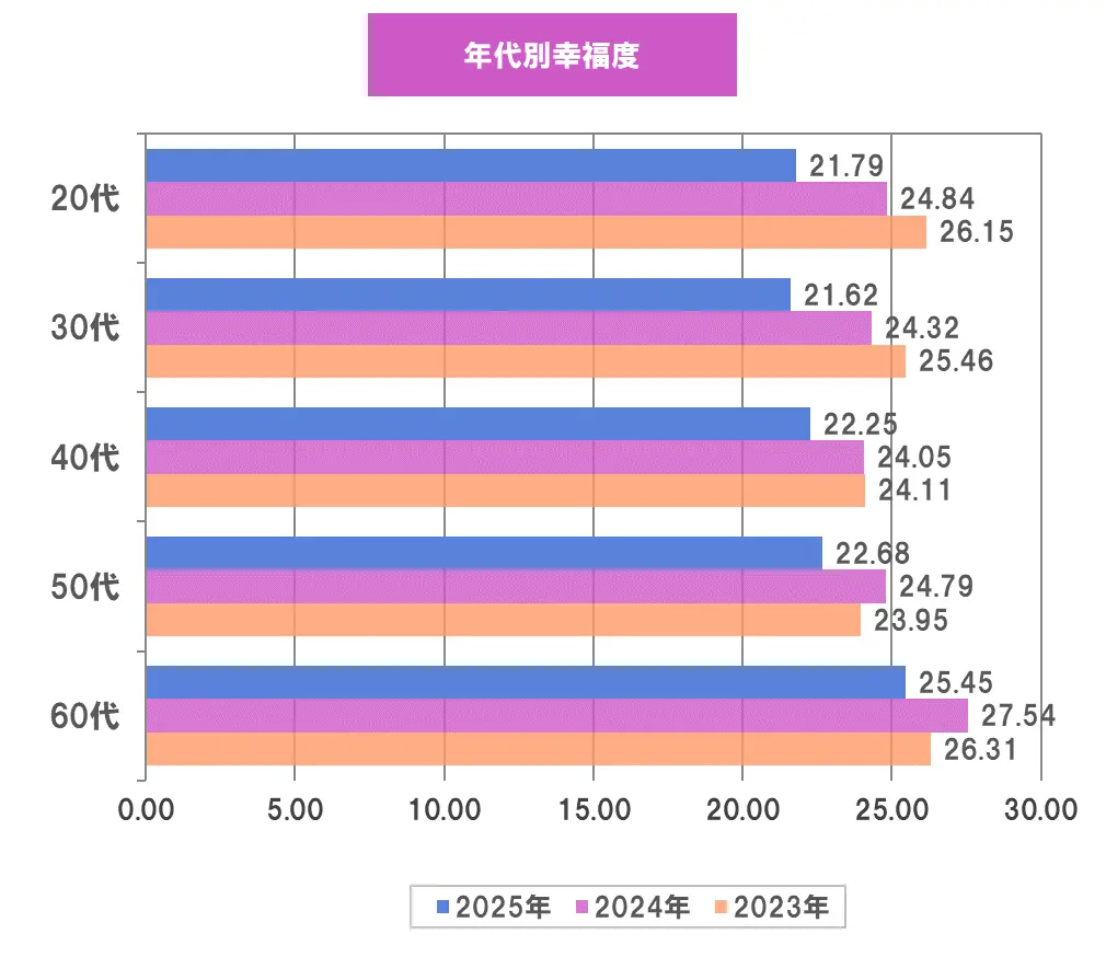 2025年度調査の幸福度を年代別に集計してみたところ、60代(25.45点)、50代(22.68点)、40代(22.25点)、20代(21.79点)、30代(21.62点)という順で幸福度が高くなりました。おおむね年代が上がるにつれて幸福度が高くなる傾向があるようです。