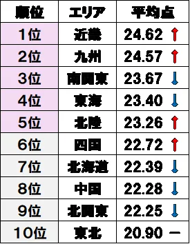 3位は南関東エリア(23.67点)で、昨年調査の2位から1ランクダウンとなりました。