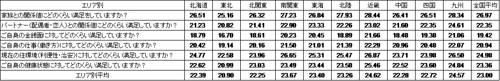 2位は、九州エリア(24.57点)でした。項目別では、「パートナー(配偶者・恋人)との関係値」がトップでした。「家族との関係値」がトップの近畿とは僅差の2位、「金銭面」「仕事(働き方)」「健康状態」も2位となっています。