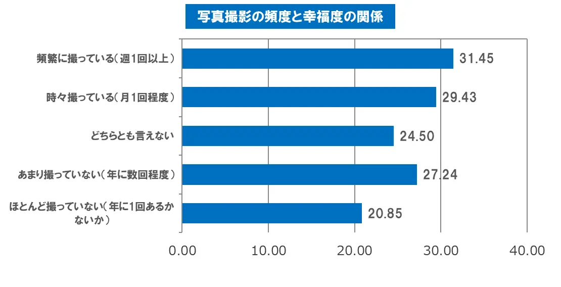「頻繁に撮っている」回答者の幸福度は31.45点と最も高く、「時々撮っている」(29.43点)、「あまり撮っていない」(27.24点)、「どちらとも言えない」(24.50点)、「ほとんど撮っていない」(20.85点)という順でした。