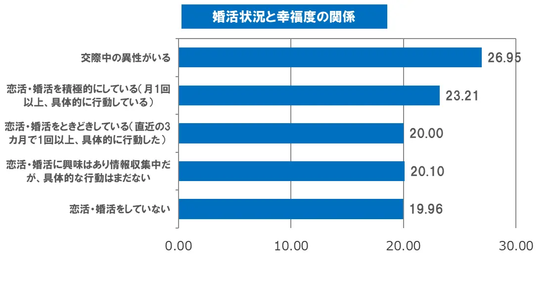 「総合的な満足度」と掛け合わせて幸福度を算出したところ、「交際中の異性がいる」人の幸福度の平均が26.95点、「恋活・婚活を積極的にしている」人が23.21点、「恋活・婚活をときどきしている」人が20.00点、「恋活・婚活に興味はあり情報収集中だが、具体的な行動はまだない」人が20.10点、「恋活・婚活をしていない」人が19.96点という結果になりました。