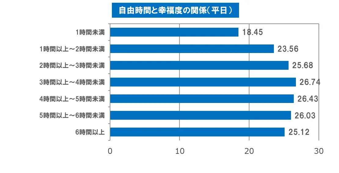 平日については、自由時間が「3時間以上~4時間未満」のときに幸福度の平均が26.74点と最も高くなっていました。休日では、「4時間以上~5時間未満」が平均26.74点で最高値に。「ワークライフバランス」と言うようにバランスが大切なのか、平日も休日も自由時間がそれよりも多くなると幸福度は下がっていく傾向にあるようです。