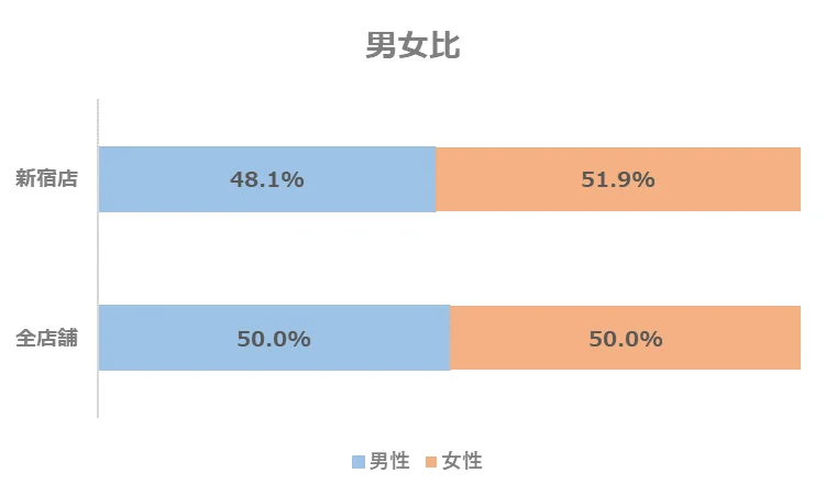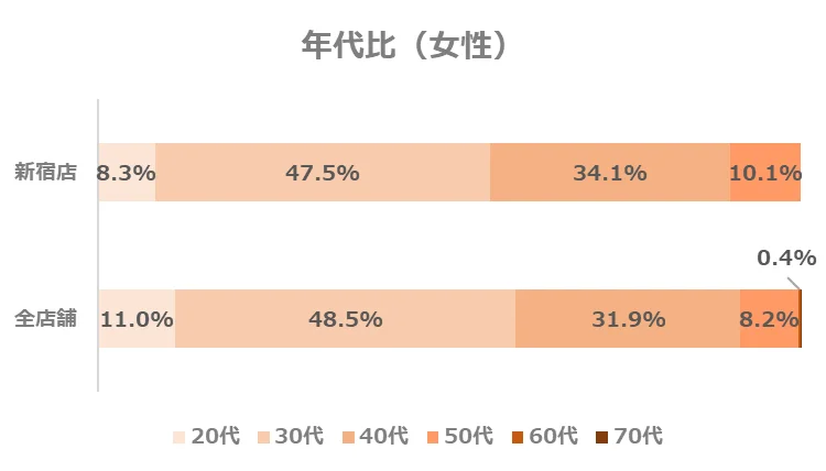 女性は20代の割合はやや低いものの、30~40代の割合が高い点は全店舗と同様の傾向です。