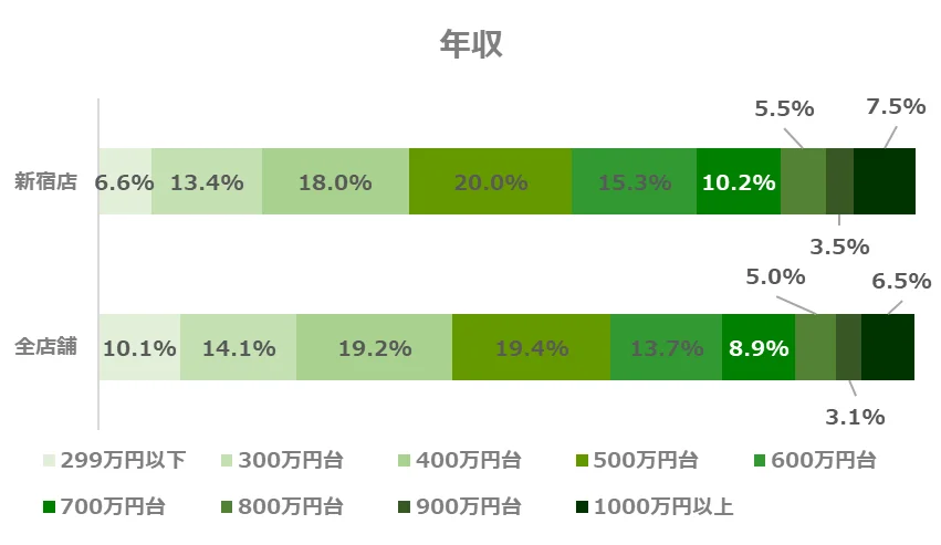年収500万円台以上のすべての年収帯において、新宿店の割合が全店舗を上回っています。特に女性は年収600〜900万円台の割合が全店舗と比較して高いことから、都心で高い年収とキャリアを築いている女性が結婚相談所での効率的かつ質の高い出会いを求めていることがわかります。