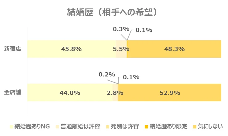 あわせて、お相手に求める結婚歴についてのデータを見てみると、「結婚歴ありNG」と「普通離婚は許容」と回答した方の割合は全店舗と比べやや高い傾向があります。