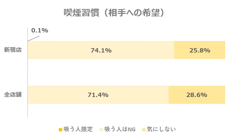 お相手に求める喫煙の習慣についてのデータを見てみると、「吸う人はNG」と回答した人は全店舗よりやや多い結果となりました。