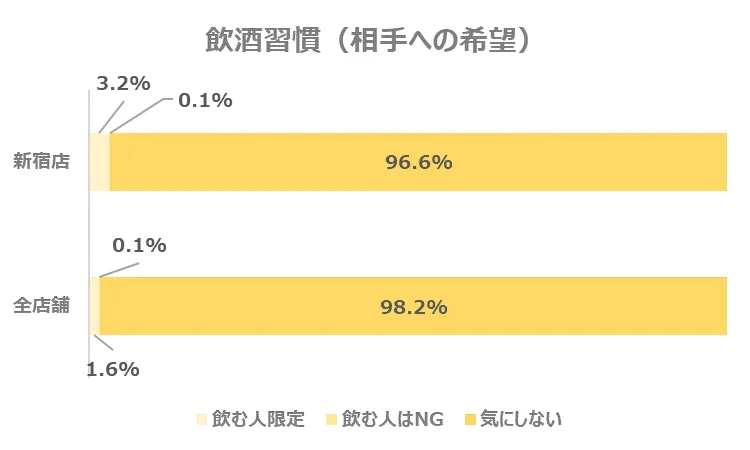 お相手に求める飲酒の習慣について見てみると、「飲む人限定」と答えた方の割合は全店舗の1.6%に対し、新宿店では3.2%と2倍となりました。
