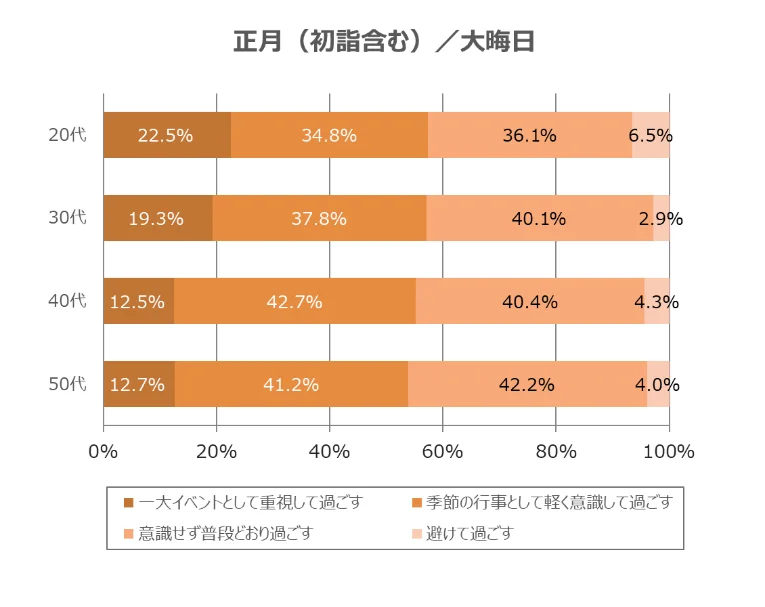 「一大イベントとして重視して過ごす」割合が高かったのは、1位「正月(初詣含む)/大晦日」(18.2%)、2位「誕生日」(15.5%)、3位「クリスマス」(12.2%)という順番になりました。「季節の行事として軽く意識して過ごす」と回答した割合も合算してみると、1位「正月(初詣含む)/大晦日」(56.2%)、2位「クリスマス」(46.9%)、3位「誕生日」(46.5%)となりました。2位と3位こそ入れ替わりましたが、正月/大晦日、クリスマス、誕生日という顔ぶれは変わりませんでした。