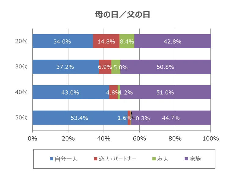 全体の回答を集計してみると、「正月(初詣含む)/大晦日」「母の日/父の日」は家族と過ごしたいが最多となり、「バレンタインデー/ホワイトデー」「クリスマス」「誕生日」は恋人・パートナーと過ごしたいイベントのなかで上位となりました。