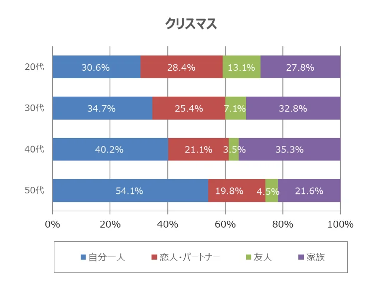 こちらの結果も年代別に集計してみました。20代の傾向として、「正月(初詣含む)/大晦日」を除き、「自分一人」で過ごしたいと回答した割合が年代別に見て最も少なくなっていました。
