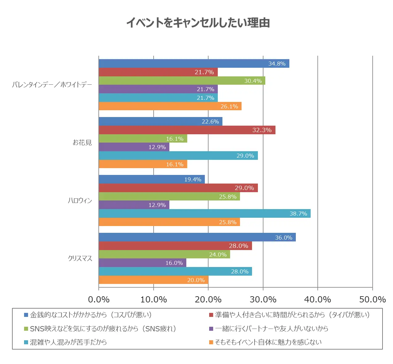 「金銭的なコストがかかるから(コスパが悪い)」をキャンセルしたい理由として挙げる人が最も多くなったのが「バレンタインデー/ホワイトデー」(34.8%)と「クリスマス」(36.0%)でした。